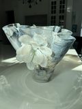 Elegant glass vase with a delicate white flower design, shimmering in soft light.