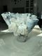Abstract glass sculpture with teal and clear fragments on a reflective base.