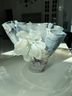 Colorful fused glass sculpture with blue and green waves and clear textured bubbles.